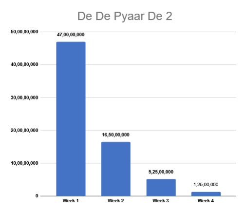 De De Pyaar De 2 managed to stay afloat in 4th week. It netted Rs. 0.80 crore in the fourth weekend, and an additional Rs. 0.45 crore during the weekdays. Therefore, the total for the fourth week was Rs. 1.25 crore. Grand total for 4 weks: Rs. 70 crore.