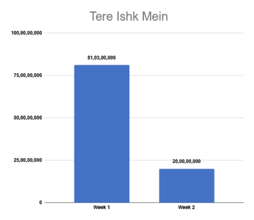 Tere Ishk Mein did well in 2nd week, too, in spite of the formidable opposition of Dhurandhar. It joined the Rs. 100-crore club on the 14th day. The second weekend started with a take of Rs. 3.25 crore. Collections on Saturday and Sunday went up to Rs. 4.90 crore and Rs. 5.10 crore respectively. After a second weekend total of Rs. 13.25 crore, collections for the weekdays were as follows: Monday – Rs. 1.85 crore, Tuesday – Rs. 2.15 crore, Wednesday – Rs. 1.50 crore, Thursday – Rs. 1.25 crore. WIth the total for the weekdays being Rs. 6.75 crore, the second week closed at Rs. 20 crore. Grand total for 2 weeks: Rs. 101.03 crore.