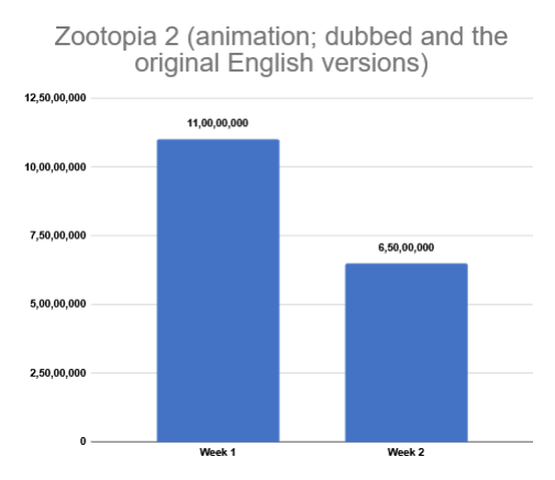 Zootopia 2 (animation; dubbed and the original English versions) did quite well in the second week too. It added Rs. 4 crore to its kitty in the second weekend, and another Rs. 2.50 crore during the weekdays. Hence the total for 2nd week was Rs. 6.50 crore. Grand total for 2 weeks: Rs. 17.50 crore.