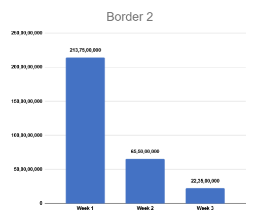 Border 2 dropped markedly in the third week too. It netted Rs. 2.85 crore on the first day of the third weekend. Collections went up to Rs. 5.35 crore on Saturday, and further to Rs. 7.25 crore on Sunday, taking the third weekend total to Rs. 15.45 crore. Collections during the weekdays were: Monday – Rs. 1.80 crore, Tuesday – Rs. 2.15 crore, Wednesday – Rs. 1.50 crore, Thursday – Rs. 1.45 crore. With the total for the weekdays being Rs. 6.90 crore, the third week closed at Rs. 22.35 crore. Grand total for 3 weeks: Rs. 301.60 crore.