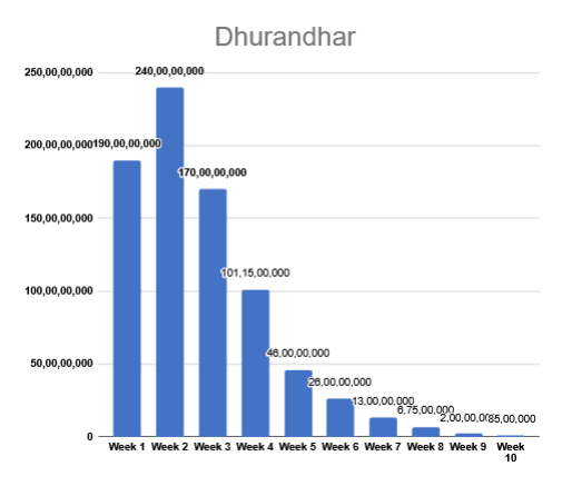 Dhurandhar netted around Rs. 0.85 crore in the tenth week. Grand total for 10 weeks: Rs.795.75 crore. If the block bookings of the first day are taken into account, the grand total for 10 weeks would be Rs. 800.75 crore.