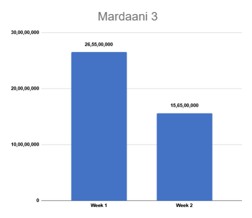 Mardaani 3 was steady at medium collections in the second week, dropping around 40% from the first week. The second weekend started with a take of Rs. 2.15 crore on Friday. Collections on Saturday and Sunday increased to Rs. 3.85 crore and Rs.4.55 crore respectively. After a second weekend total of Rs. 10.55 crore, collections during the weekdays were as follows: Monday – Rs. 1.30 crore, Tuesday – Rs. 1.60 crore, Wednesday – Rs. 1.10 crore, Thursday – Rs. 1.10 crore. Hence the total for the weekdays was Rs. 5.10 crore. In this way, the total for 2nd week was Rs. 15.65 crore. Grand total for 2 weeks: Rs. 42.20 crore.