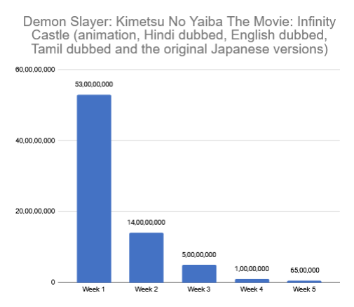 Demon Slayer: Kimetsu No Yaiba The Movie: Infinity Castle (animation, Hindi dubbed, English dubbed, Tamil dubbed and the original Japanese versions) is in its last leg. It netted just Rs. 0.65 crore in 5th week. Grand total for 5 weeks: Rs. 73.65 crore.