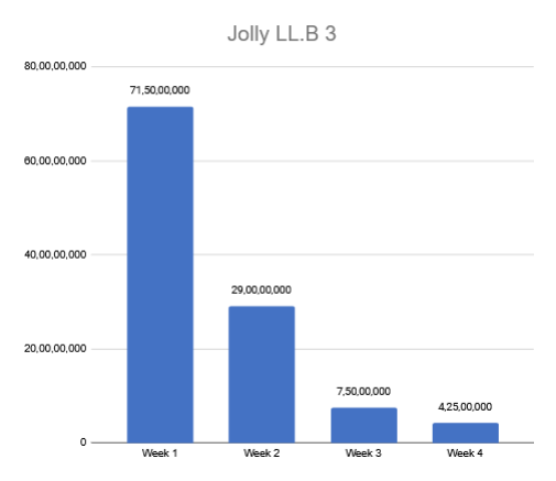 Jolly LL.B 3 dropped around 40% in the fourth week. It collected approximately Rs. 2.75 crore in the fourth weekend. The total for the weekdays was Rs. 1.50 crore. Hence the total for the fourth week was Rs. 4.25 crore. Grand total for 4 weeks: Rs. 112.25 crore.
