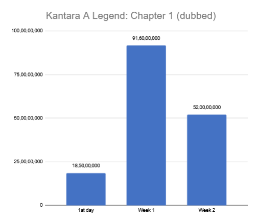 Kantara A Legend: Chapter 1 (dubbed) remained the topmost grosser in 2nd week too. The second weekend started with a take of Rs. 7 crore on Friday. Collections doubled to Rs. 14 crore on Saturday. The total for Sunday was Rs. 14.50 crore. After a second weekend total of Rs. 35.50 crore, collections for the weekdays were as follows: Monday – Rs. 4.25 crore, Tuesday – Rs. 5.25 crore, Wednesday – Rs. 3.75 crore, Thursday – Rs. 3.25 crore. Therefore, the total for the weekdays was Rs. 16.50 crore. In this way, the second week closed at Rs. 52 crore. Grand total for 2 weeks: Rs. 162.10 crore.