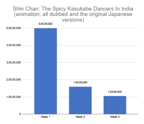 Shin Chan: The Spicy Kasukabe Dancers In India (animation; all dubbed and the original Japanese versions) was steady at low collections in the third week. The Hindi dubbed version, of course, fared the best. It netted Rs. 0.75 crore in the third weekend, and another Rs. 0.30 crore during the weekdays. Therefore, the total for the third week was Rs. 1.05 crore. Grand total for 3 weeks: Rs. 7.65 crore.
