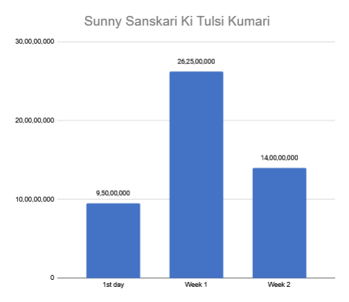 Sunny Sanskari Ki Tulsi Kumari dropped markedly in the second week. It collected Rs. 2.25 crore on the first day (Friday) of the second weekend. Collections on Saturday and Sunday were Rs. 3.25 crore and Rs. 3.50 crore respectively. After a second weekend total of Rs. 9 crore, collections for the weekdays were: Monday – Rs. 1.40 crore, Tuesday – Rs. 1.55 crore, Wednesday – Rs. 1.05 crore, Thursday – Rs. 1 crore. In this way, the total for the weekdays was Rs. 5 crore. Therefore, the total for the second week was Rs. 14 crore. Grand total for 2 weeks: Rs. 49.75 crore. If the block bookings of the first week are taken into account, the grand total for 2 weeks would be Rs. 55.50 crore.