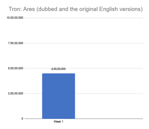 Tron: Ares (dubbed and the original English versions) did very ordinary business in the first week. It netted around Rs. 3 crore in the first weekend, and another Rs. 1.50 crore during the weekdays. Hence the total for 1st week was Rs. 4.50 crore.