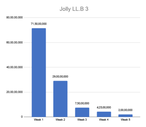 Jolly LL.B 3 dropped a lot in the fifth week in spite of Diwali. It added Rs. 2 crore to its kitty in 5th week, taking its grand total for 5 weeks to Rs. 114.25 crore.