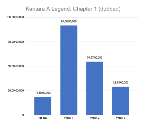 Kantara A Legend: Chapter 1 (dubbed) was quite good in 3rd week too. It reaped the benefit of the Diwali holidays in spite of the opposition of the two Diwali releases. The third weekend started with a take of Rs. 3.30 crore on Friday. COllections on Saturday went up to Rs. 4.20 crore. The collection of Rs. 5.45 crore on Sunday took the third weekend total to Rs. 12.95 crore. Collections for the weekdays were: Monday – Rs. 3.20 crore, Tuesday – Rs. 4.10 crore, Wednesday – Rs. 4.70 crore, Thursday – Rs. 4 crore. In this way, the total for the weekdays was an impressive Rs. 16 crore. Hence the third week closed at Rs. 28.95 crore. Grand total for 3 weeks: Rs. 193.62 crore.
