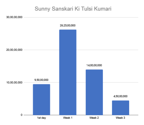 Sunny Sanskari Ki Tulsi Kumari was ordinary in the third week, the Diwali festival aiding its collections by at least 20%. It added Rs. 2 crore in the third weekend, and another Rs. 2.50 crore during the weekdays, taking its total for the third week to Rs. 4.50 crore. Therefore, the grand total for 3 weeks was Rs. 54.25 crore. If the block bookings of the first week are taken into account, the grand total for 3 weeks would be Rs. 60 crore.
