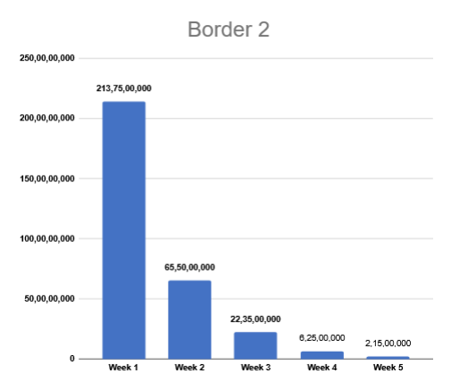Border 2 is in its last lap. It added Rs. 2.15 crore to its kitty in the fifth week. Therefore, its grand total for 5 weeks is Rs. 310 crore.