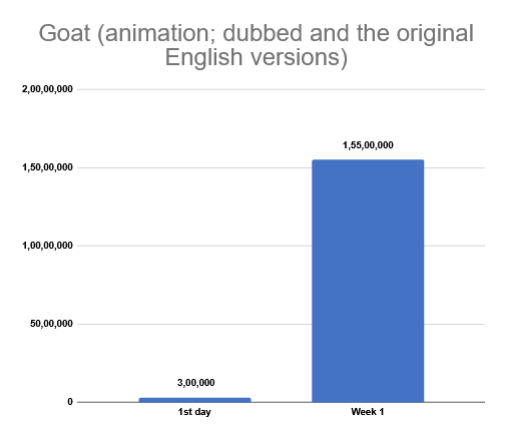 Goat (animation; dubbed and the original English versions) did average business in the first week. After collecting Rs. 0.03 crore on Thursday in paid previews, it netted Rs. 1.05 crore in the first weekend, and an additional Rs. 0.50 crore during the weekdays. Hence the total for 1st week was Rs. 1.55 crore. Grand total for 8 days: Rs. 1.58 crore.