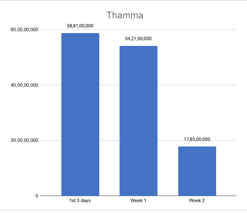 Thamma dropped badly in the second week after an impressive first week. Yet, it managed to reach a total of almost Rs. 130 crore at the end of the second week. The second weekend started with a take of Rs. 3.10 crore on Friday. Collections increased to Rs. 4.15 crore on Saturday. The total for Sunday was Rs. 4.95 crore. After a second weekend total of Rs. 12.20 crore, collections for the weekdays were: Monday – Rs. 1.25 crore, Tuesday – Rs. 1.95 crore, Wednesday – Rs. 1.55 crore, Thursday – Rs. 0.90 crore. In this way, the total for the weekdays was Rs. 5.65 crore. Hence the second week closed at Rs. 17.85 crore. Grand total for 2 weeks: Rs. 130.87 crore.