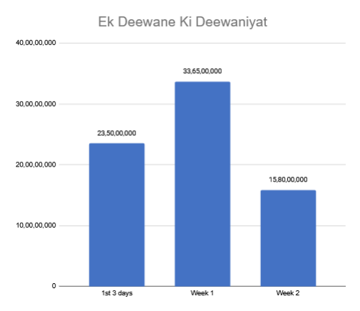 Ek Deewane Ki Deewaniyat was super-steady at medium collections in 2nd week. The second weekend started with a net collection of Rs. 2.35 crore on Friday. Collections on Saturday went up to Rs. 3.15 crore, and on Sunday, to Rs. 3.75 crore. Therefore, the total for the second weekend was Rs. 9.25 crore. The weekdays reported collections as follows: Monday – Rs. 1.60 crore, Tuesday – Rs. 2 crore, Wednesday – Rs. 1.75 crore, Thursday – Rs. 1.20 crore. Hence the total for the weekdays was Rs. 6.55 crore. In this way, the second week closed at Rs. 15.80 crore. Grand total for 2 weeks: Rs. 72.95 crore. Excellent!