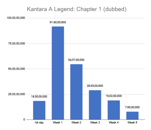 Kantara A Legend: Chapter 1 (dubbed) collected Rs. 1.05 crore on the first day (Friday) of the fifth week. The totals for Saturday and Sunday were Rs. 1.75 crore and Rs. 2.05 crore respectively. After a fifth weekend total of Rs. 4.85 crore, collections for the weekdays were as follows: Monday – Rs. 0.60 crore, Tuesday – Rs. 0.95 crore, Wednesday – Rs. 0.90 crore, Thursday – Rs. 0.60 crore. With the total for the weekdays being Rs. 3.05 crore, the fifth week closed at Rs. 7.90 crore. Grand total for 5 weeks: Rs. 220.54 crore.