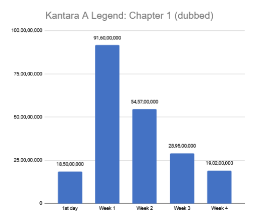Kantara A Legend: Chapter 1 (dubbed) managed to do fair business in the fourth week in spite of two Diwali oppositions. The festive holidays aided the film score in the fourth weekend. It started the fourth weekend with a take of Rs. 3.50 crore. Collections on Saturday and Sunday were Rs. 4.25 crore and Rs. 4.19 crore respectively. After a fourth weekend total of Rs. 11.94 crore, collections for the weekdays were as follows: Monday – Rs. 1.85 crore, Tuesday – Rs. 2.28 crore, Wednesday – Rs. 1.55 crore, Thursday – Rs. 1.40 crore. In this way, the total for the weekdays was Rs. 7.08 crore. Therefore, the total for 4th week was Rs. 19.02 crore. Grand total for 4 weeks: Rs. 212.64 crore.