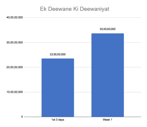 Ek Deewane Ki Deewaniyat did very well in the first week after a fair start on Diwali (Tuesday, October 21). The drop during the weekdays was not alarming. After a 3-day (Tuesday to Thursday) total of Rs. 23.50 crore, it netted Rs. 5.85 crore on Friday. Collections increased to Rs. 6.75 crore on Saturday, and to Rs. 7.25 crore on Sunday. Therefore, the total for the first 6-day weekend was Rs. 43.35 crore. Collections for the weekdays were: Monday – Rs. 3.65 crore, Tuesday – Rs. 4.50 crore, Wednesday – Rs. 3 crore, Thursday – Rs. 2.65 crore. So, the total for the weekdays was Rs. 13.80 crore. Hence the first 10-day week closed at Rs. 57.15 crore.