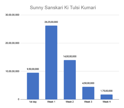 Sunny Sanskari Ki Tulsi Kumari is in its last lap. It did average in the fourth week, collecting Rs. 1.10 crore in the weekend, and another Rs. 0.65 crore during the weekdays. In this way, the total for 4th week was Rs. 1.75 crore. Grand total for 4 weeks: Rs. 56 crore. If the block bookings of the first week are taken into account, the grand total for 4 weeks would be Rs. 61.75 crore.