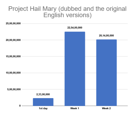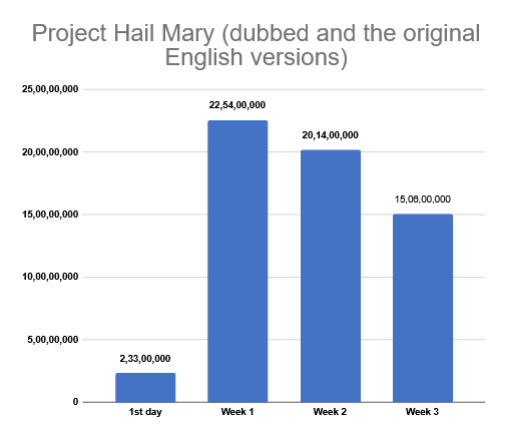 JAIPUR: Bhooth Bangla opened on 16th, 1st day Inox CP (2 shows) 22,897, Inox Vaibhav (1 show) 11,338, Inox Pink Square (3 shows) 66,008, Cinepolis World Trade Park (3 shows) 63,271, Inox Elements Mall (2 shows) 34,660, Inox Sunny Trade Center (2 shows) 37,532, Cinepolis Triton Mega (3 shows) 96,166, Inox GT Central Mall (4 shows) 61,842, Miraj EP (2 shows) 95,196, Inox JTM (2 shows) 35,677, PVR (5 shows) 1,27,327, DD Cinemas Viva City Mall (2 shows) 56,093, Cinepolis JOI (5 shows) 1,12,737, Gold City Plaza (2 shows) 25,169, total from 14 cinemas 8,45,913. Dacoit Ek Prem Katha 1st week Inox CP (10 shows) 28,616, Inox Vaibhav (13 shows) 22,064, Inox Pink Square (17 shows) 88,530, Cinepolis World Trade Park (16 shows) 1,52,194, Inox Elements Mall (13 shows) 52,298, Inox Sunny Trade Center (20 shows) 1,27,617, Cinepolis Triton Mega (29 shows) 2,37,195, Inox GT Central Mall (22 shows) 3,26,876, Miraj EP (21 shows) 1,90,302, Inox JTM (14 shows) 61,890, PVR (29 shows) 2,61,777, DD Cinemas Viva City Mall (29 shows) 91,160, Cinepolis JOI (27 shows) 2,78,622, Gold City Plaza (15 shows) 39,374, total from 14 cinemas 19,58,515. The Super Mario Galaxy Movie (animation, dubbed) 2nd week Inox Sunny Trade Center (7 shows) 8,860, Inox GT Central Mall (6 shows) 23,150, Miraj EP (7 shows) 8,630, PVR (7 shows) 29,989, total from 4 cinemas 70,629. Project Hail Mary (dubbed) 3rd week Inox Sunny Trade Center (14 shows) 63,376, Miraj EP (7 shows) 33,284, Cinepolis JOI (13 shows) 45,317, total from 3 cinemas 1,41,977. Dhurandhar: The Revenge 4th week Inox CP (55 shows) 4,26,677, Inox Vaibhav (41 shows) 1,85,327, Inox Pink Square (71 shows) 7,54,559, Cinepolis World Trade Park (69 shows) 8,28,801, Inox Elements Mall (61 shows) 4,00,022, Inox Sunny Trade Center (69 shows) 8,84,112, Cinepolis Triton Mega (74 shows) 11,32,934, Inox GT Central Mall (89 shows) 5,92,119, Miraj EP (49 shows) 11,15,737, Inox JTM (55 shows) 4,03,144, PVR (101 shows) 15,07,661, DD Cinemas Viva City Mall (51 shows) 4,75,896, Cinepolis JOI (95 shows) 11,30,379, Gold City Plaza (39 shows) 1,35,779, total from 14 cinemas 99,73,147. Hoppers (animation, dubbed) 6th week Inox GT Central Mall (7 shows) 17,830, PVR (14 shows) 95,476, total from 2 cinemas 1,13,306. The Kerala Story 2: Goes Beyond 7th week Inox GT Central Mall (12 shows) 39,329. Rabb Da Radio 3 (Punjabi) 2nd week Inox Pink Square (3 shows) 4,203, Inox GT Central Mall (7 shows) 18,056, Cinepolis JOI (3 shows) 13,457, total from 3 cinemas 35,716. Ishqan De Lekhe (Punjabi) 6th week Inox Pink Square (7 shows) 13,439, Inox GT Central Mall (19 shows) 1,07,250, total from 2 cinemas 1,20,689. LIK: Love Insurance Kompany (Tamil) 1st week PVR (7 shows) 12,760, Cinepolis JOI (3 shows) 16,093, total from 2 cinemas 28,853. Dacoit (Telugu) 1st week Cinepolis Triton Mega (1 show) 813, Inox GT Central Mall (7 shows) 15,649, PVR (3 shows) 4,398, Cinepolis JOI (5 shows) 24,186, total from 4 cinemas 45,046. Pallichattambi (Malayalam) opened on 15th, 1st 2 days Inox GT Central Mall (4 shows) 1,864, PVR (2 shows) 2,321, Cinepolis JOI (2 shows) 584, total from 3 cinemas 4,769. Vaazha 2: Biopic Of A Billion Bros (Malayalam) 2nd week Inox GT Central Mall (8 shows) 19,280, PVR (8 shows) 43,183, Cinepolis JOI (7 shows) 44,990, total from 3 cinemas 1,07,453. The Super Mario Galaxy Movie (animation, E.) 2nd week Inox CP (7 shows) 1,418, Inox GT Central Mall (8 shows) 23,050, Inox JTM (6 shows) 2,004, PVR (7 shows) 49,228, Cinepolis JOI (3 shows) 6,856, total from 5 cinemas 82,556. The Drama (E.) 2nd week PVR (21 shows) 87,337. Project Hail Mary (E.) 3rd week Inox CP (13 shows) 32,663, Inox Pink Square (14 shows) 19,668, Cinepolis World Trade Park (18 shows) 1,02,527, Inox Elements Mall (7 shows) 20,922, Inox GT Central Mall (29 shows) 70,210, Miraj EP (7 shows) 34,830, Inox JTM (13 shows) 34,351, PVR (41 shows) 3,59,853, Cinepolis JOI (36 shows) 3,11,277, total from 9 cinemas 9,86,301.
